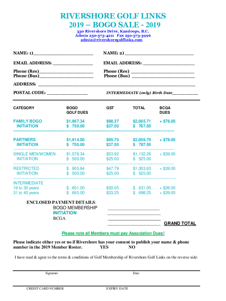 RIVERSIDE GOLF LINKS 2019 BOGO SALE 2019 330 River shore Drive, Balloons, B.C. Admin 2505734211 Fax 2505733996 admin rivershoregolflinks.compare: 1) NAME: 2) EMAIL ADDRESS: EMAIL ADDRESS: Phone (Res)