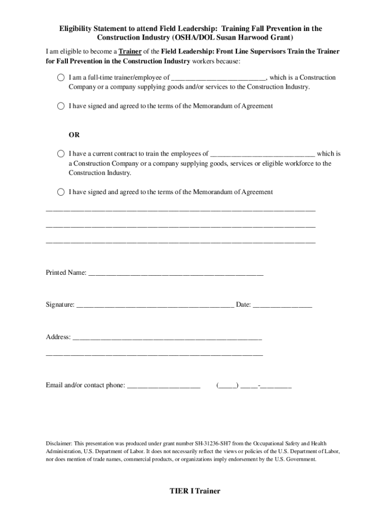 Eligibility Statement to attend Field Leadership: Training Fall Prevention in the Construction Industry (OSHA/DOL Susan Hardwood Grant) I am eligible to become a Trainer of the Field Leadership: Front
