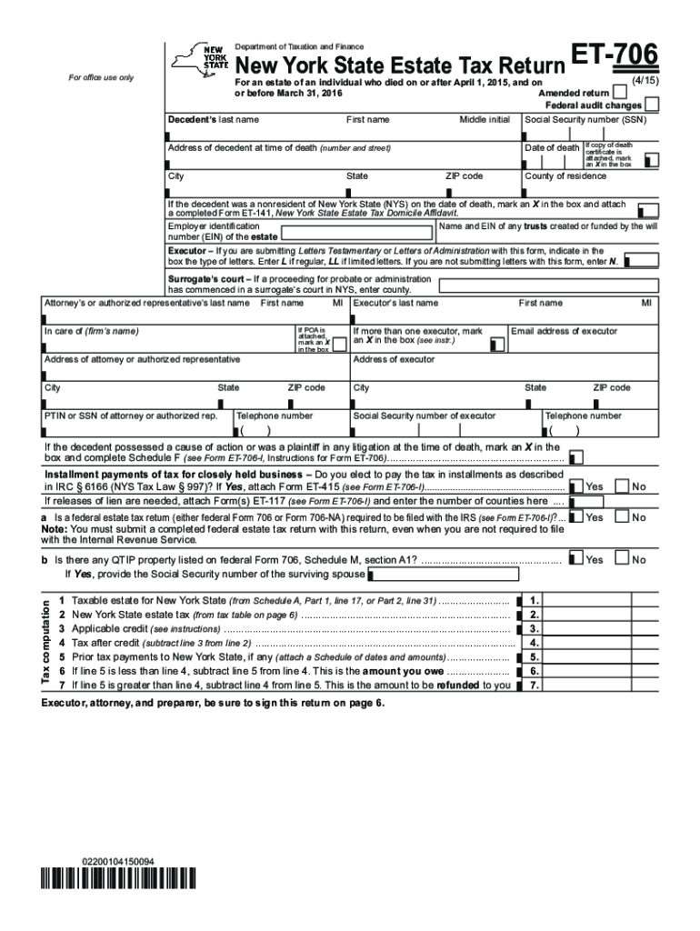 Form ET-706 is the Estate Tax Return for New York State, used to report the estate's value and calculate the estate tax owed.