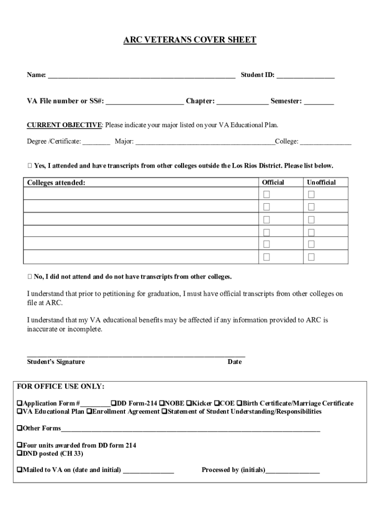 ARC VETERANS COVER Sheena: Student ID: VA File number or SS#: Chapter: Semester: CURRENT OBJECTIVE: Please indicate your major listed on your VA Educational Plan. Degree /Certificate: Major: College: