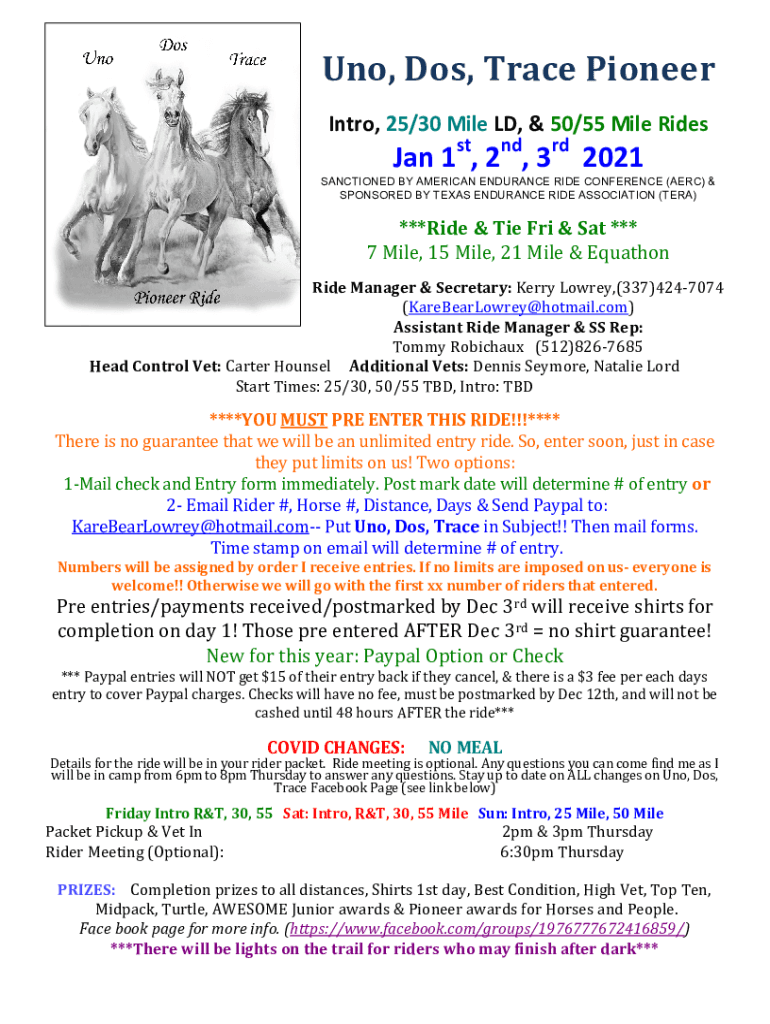 UNO, Dos, Trace Pioneer Intro, 25/30 Mile LD, & 50/55 Mile Rides Jan 1st, 2nd, 3rd 2021SANCTIONED BY AMERICAN ENDURANCE RIDE CONFERENCE (ARC) & SPONSORED BY TEXAS ENDURANCE RIDE ASSOCIATION (TERM)***Ride