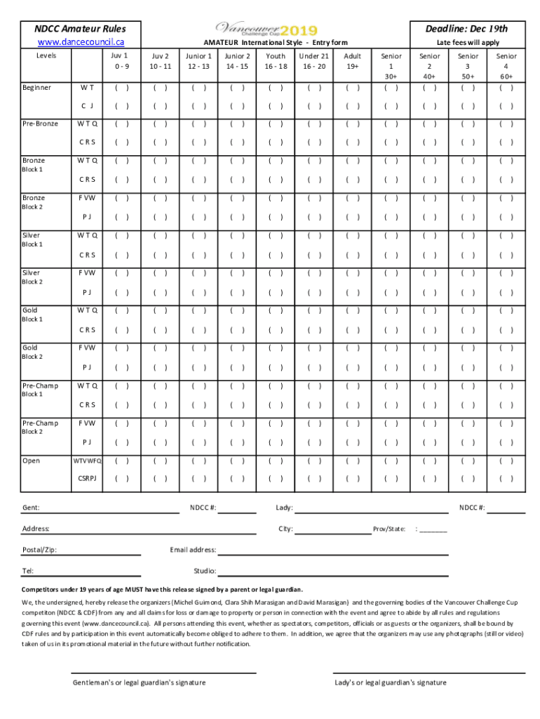Deadline: Dec 19thNDCC Amateur Rules www.dancecouncil.ca LevelsBeginnerPreBronzeBronzeAMATEUR International Style Entry form 1 09Juv 2 10 11Junior 1 12 13Junior 2 14 15Youth 16 18Under 21 16 20Late
