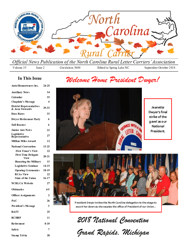 North Carolina Rural CarrierOfficial News Publication of the North Carolina Rural Letter Carriers Association Volume 35Issue 2Circulation 5600In This Issue Auto/Homeowners Ins.2425Auxiliary News34Calendar35Chaplains