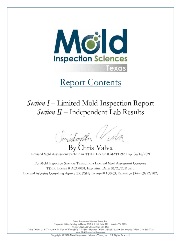 Report Contents Section I Limited Mold Inspection Report Section II Independent Lab Results Chris Valve Licensed Mold Assessment Technician: DLR License # MAT1292, Exp. 06/16/2021 For Mold Inspection
