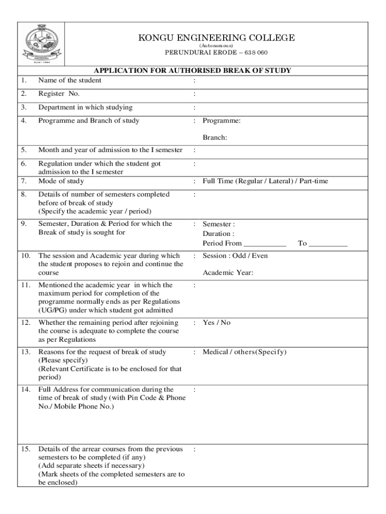 KONG ENGINEERING COLLEGE (Autonomous)PERUNDURAI ERODE 638 0601.APPLICATION FOR Authorized BREAK OF STUDY Name of the student :2. Register No.:3. Department in which studying:4. Program and Branch