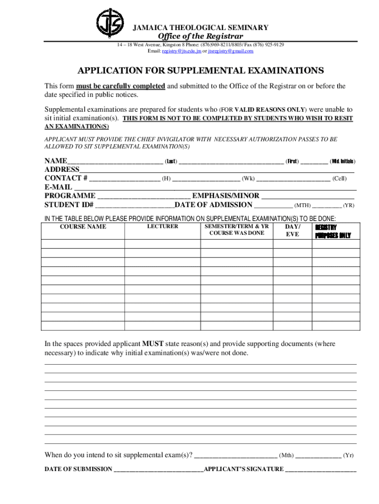 JAMAICA THEOLOGICAL SEMINARY Office of the Registrar 14 18 West Avenue, Kingston 8 Phone: (876)9698211/8803/ Fax (876) 9259129 Email: registry its.edu.JM or registry Gmail. Complication FOR SUPPLEMENTAL