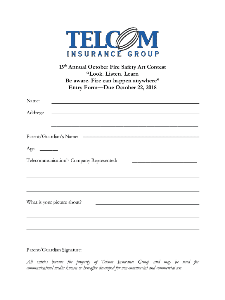 15th Annual October Fire Safety Art Contest Look. Listen. Learn Be aware. Fire can happen anywhere Entry Fondue October 22, 2018, Name: Address: Parent/Guardians Name: Age: Telecommunications Company