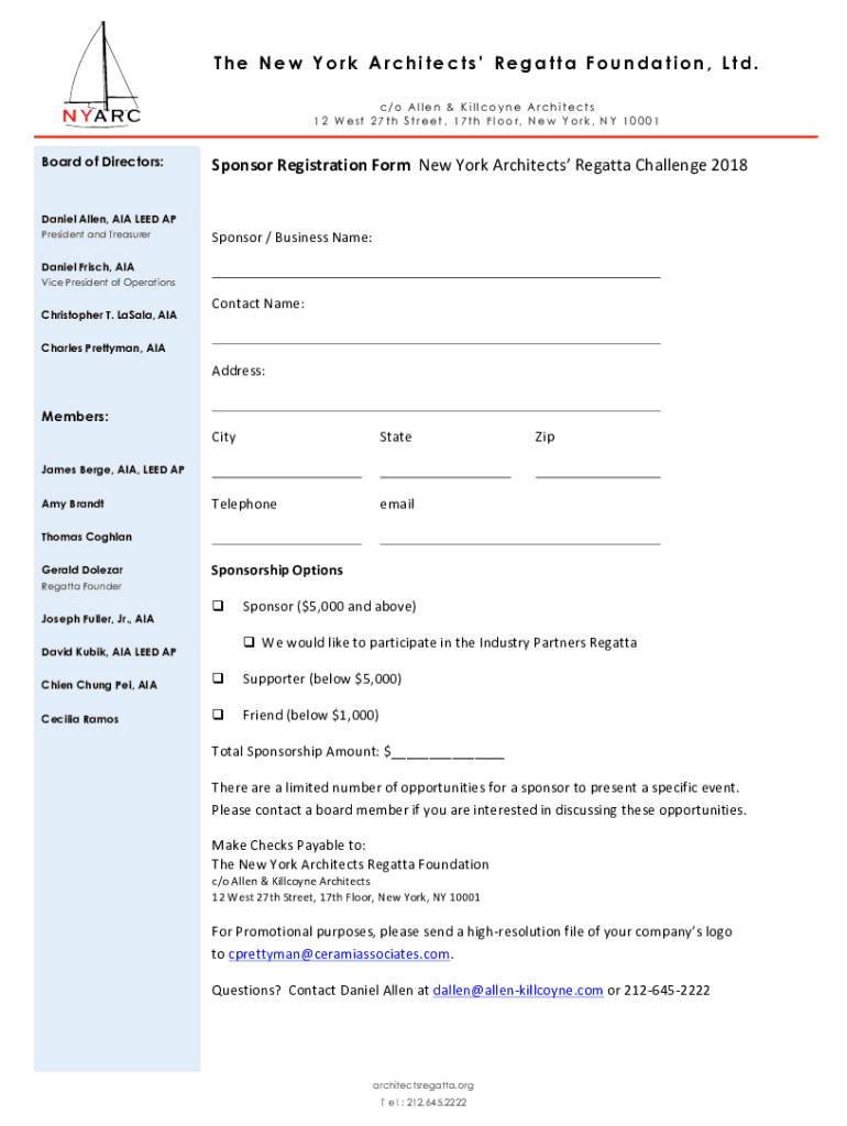 The New York Architects Regatta Foundation, Ltd. c/o Allen & Silicone Architects 12 W est 27th Street, 17th Floor, New To OK, NY 10001Board of Directors:Daniel Allen, AIR LEED Sponsor Registration
