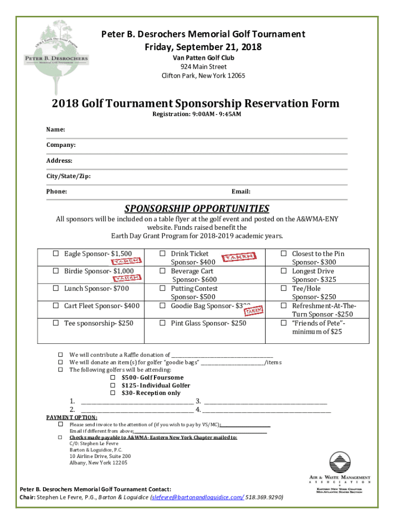 Peter B. Destroyers Memorial Golf Tournament Friday, September 21, 2018, Van Pattern Golf Club 924 Main Street Clifton Park, New York 120652018 Golf Tournament Sponsorship Reservation Form Registration: