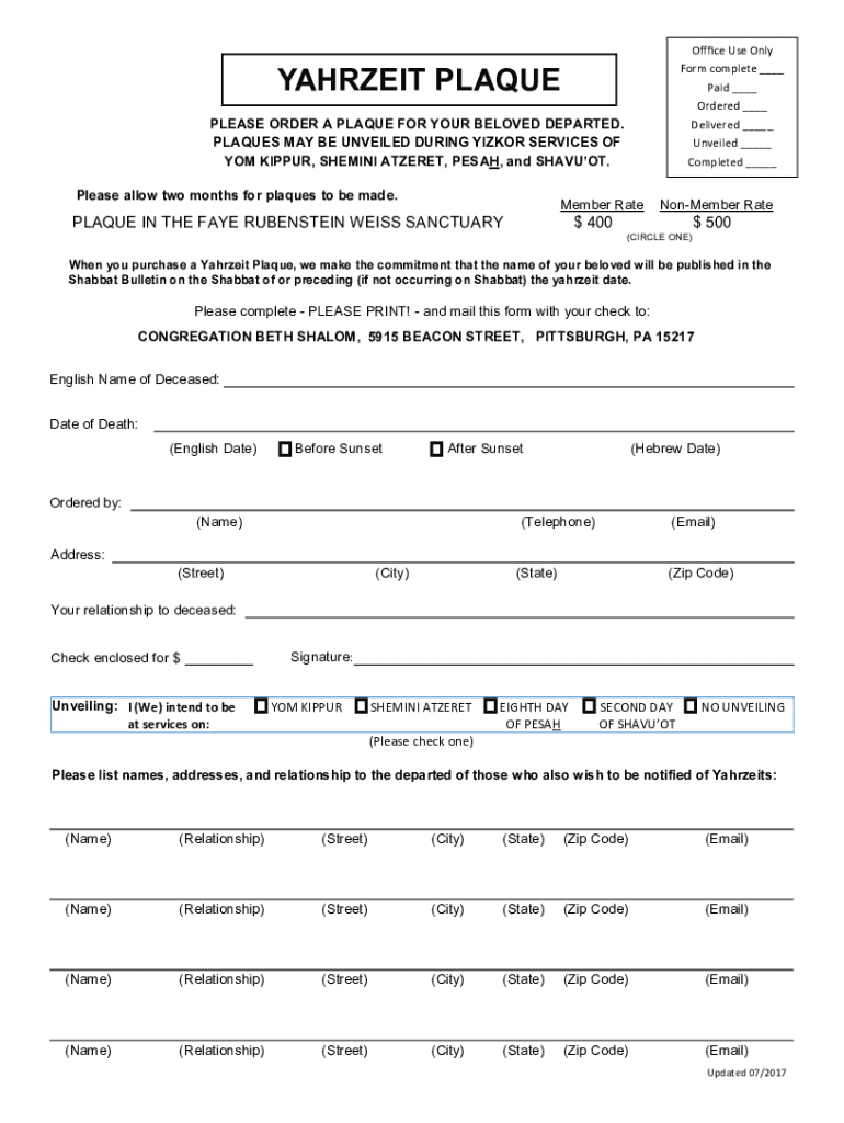 Office Use Only Form complete Paid Ordered Delivered Unveiled Completed YAHTZEE PLAQUE PLEASE ORDER A PLAQUE FOR YOUR BELOVED DEPARTED. PLAQUES MAY BE UNVEILED DURING MINOR SERVICES OF YOM KIPPUR,