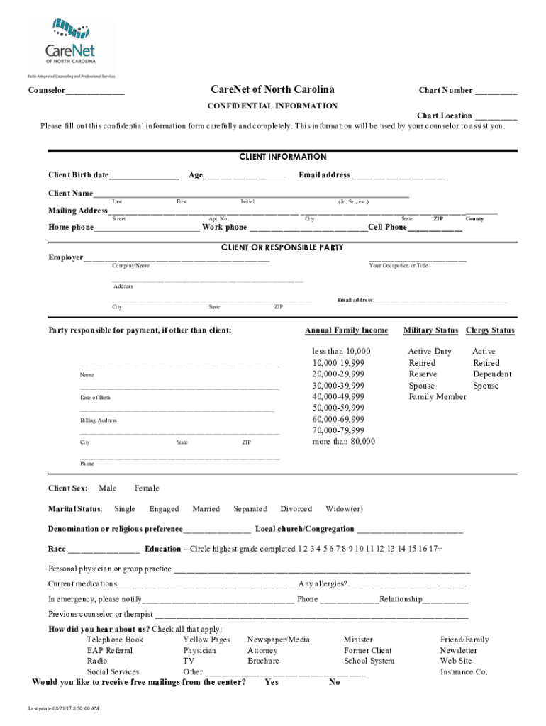 Carpet of North CarolinaCounselor Chart Number CONFIDENTIAL INFORMATION Chart Location Please fill out this confidential information form carefully and completely. This information will be used by