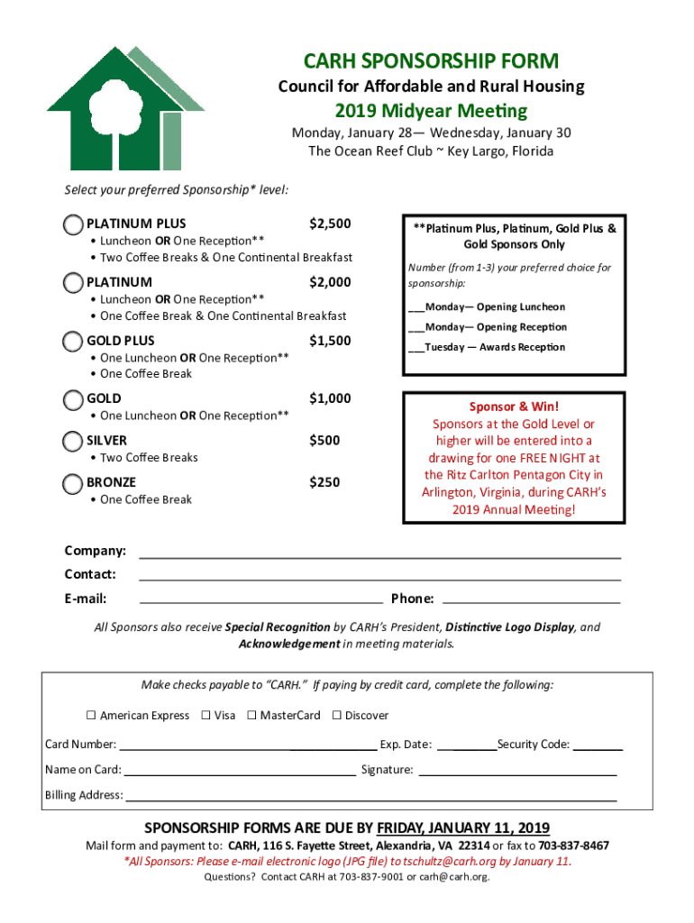 CARHSPONSORSHIPFORM CouncilforAordableandRuralHousing2019MidyearMee NG Monday,January28Wednesday,January30 TheOceanReefClubKeyLargo, Florida SelectyourpreferredSponsorship×level: PLATINUMPLUS $2,500