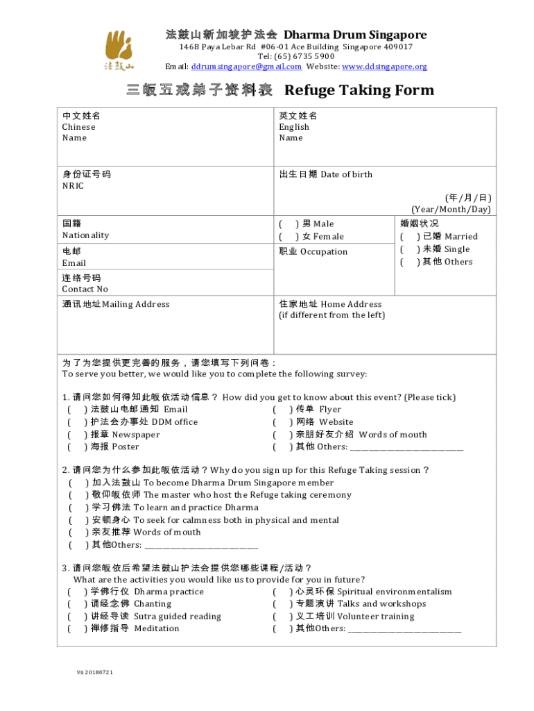 Dharma Drum Singapore146B Pay Lear Rd#0601 Ace Building Singapore 409017Tel: (65) 6735 5900Email: ddrumsingapore Gmail.website: www.ddsingapore.org Refuge Taking FormChineseNameEnglishNameNRIC Date
