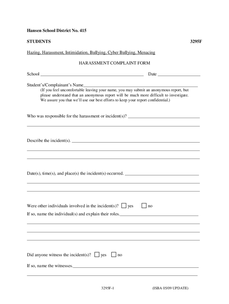 Hansen School District No. 415 STUDENTS3295FHazing, Harassment, Intimidation, Bullying, Cyberbullying, Menacing HARASSMENT COMPLAINT FORM School Date Students/Complainants Name (If you feel uncomfortable