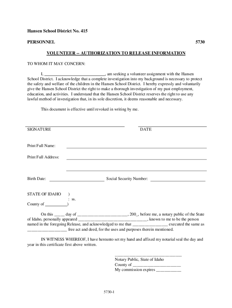 Hansen School District No. 415 PERSONNEL5730VOLUNTEER AUTHORIZATION TO RELEASE INFORMATION TO WHOM IT MAY CONCERN: I, am I seeking a volunteer assignment with the Hansen School District. I acknowledge