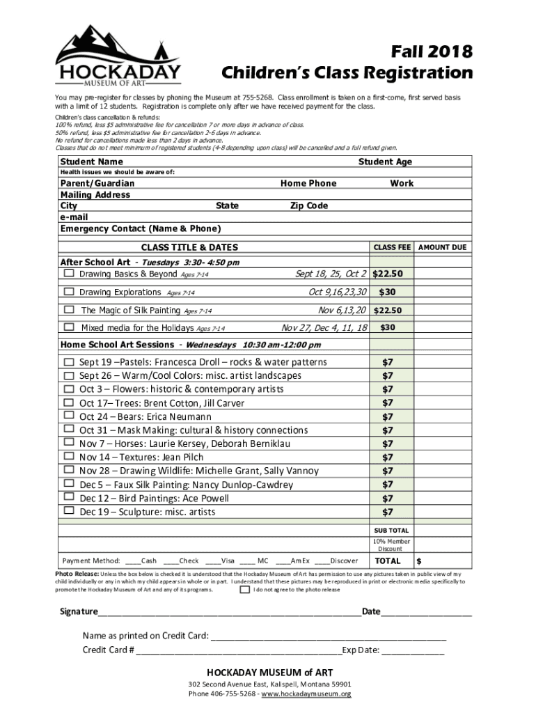 Fall 2018 Children's Class Registration You may preregister for classes by phoning the Museum at 7555268. Class enrollment is taken on a first come, first served basis with a limit of 12 students.