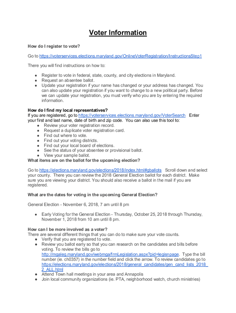 Voter Information How do I register to vote? Go to https://voterservices.elections.maryland.gov/OnlineVoterRegistration/InstructionsStep1 There you will find instructions on how to: Register to vote