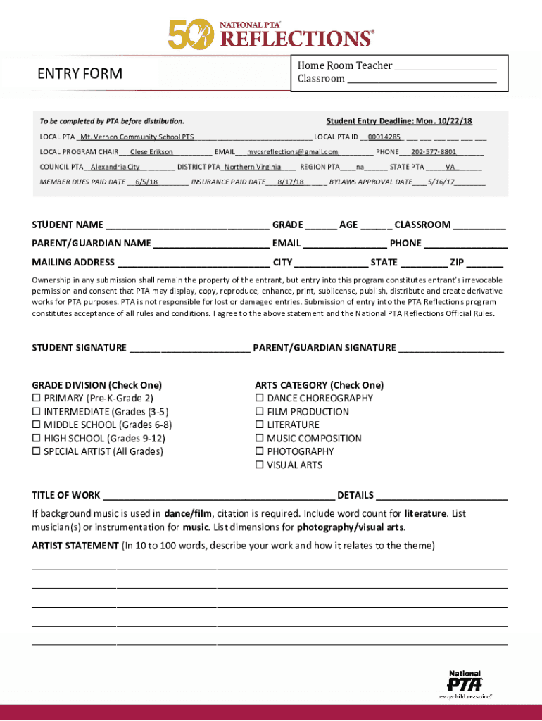 ENTRY FORM To be completed by PTA before distribution. Home Room Teacher Classroom Student Entry Deadline: Mon. 10/22/18LOCAL PTA Mt. Vernon Community School PTS LOCAL PTA ID 00014285 LOCAL PROGRAM