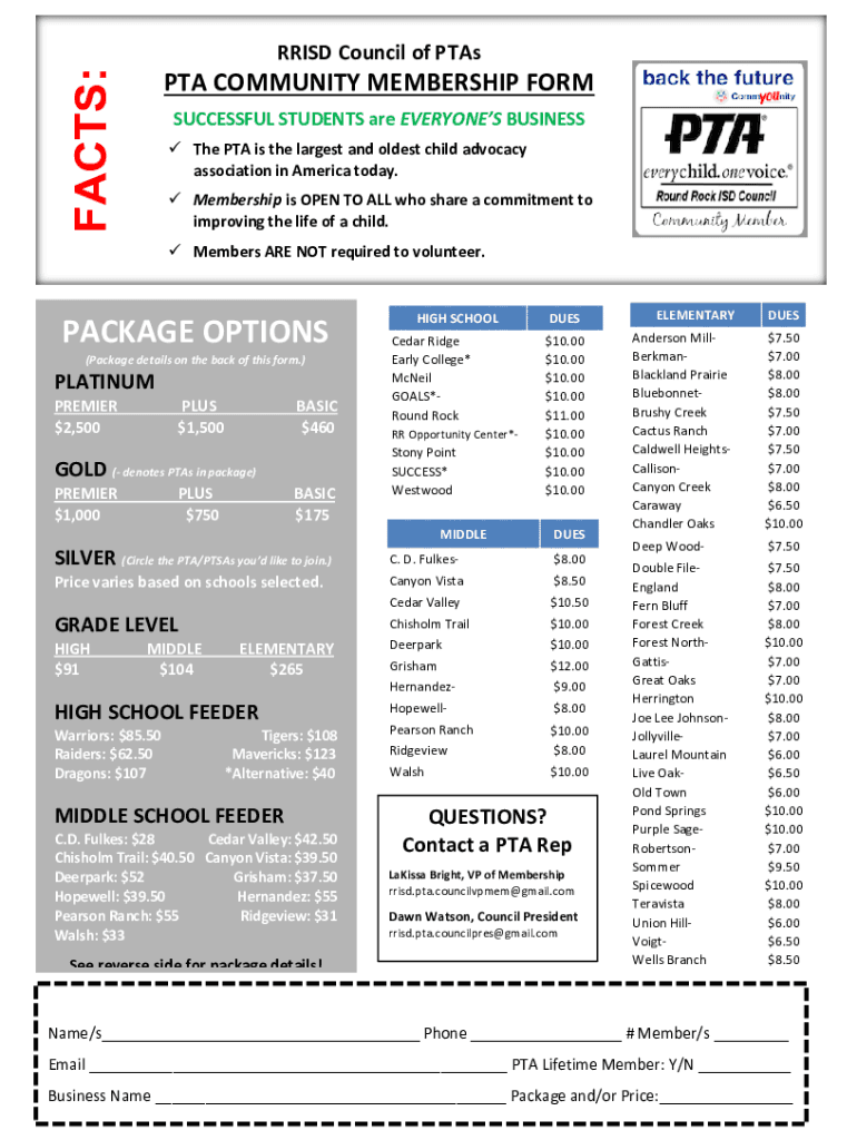 FACTS:RR ISD Council of Pasta COMMUNITY MEMBERSHIP FORM SUCCESSFUL STUDENTS are EVERYONE's BUSINESS The PTA is the largest and oldest child advocacy association in America today. Membership is OPEN