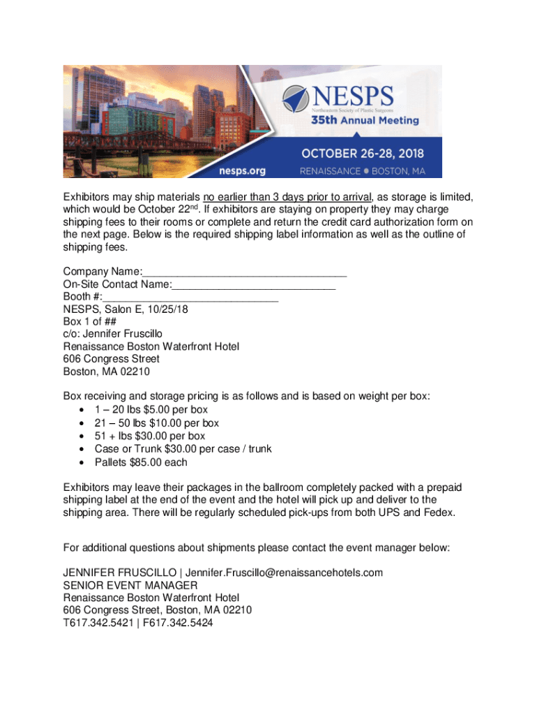 Exhibitors may ship materials no earlier than 3 days prior to arrival, as storage is limited, which would be October 22nd. If exhibitors are staying on property they may charge shipping fees to their