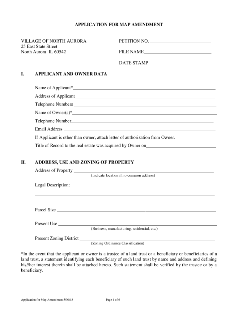 APPLICATION FOR MAP AMENDMENTVILLAGE OF NORTH AURORA 25 East State Street North Aurora, IL 60542PETITION NO. FILE NAME DATE STAMP.APPLICANT AND OWNER DATA Name of Applicant* Address of Applicant Telephone