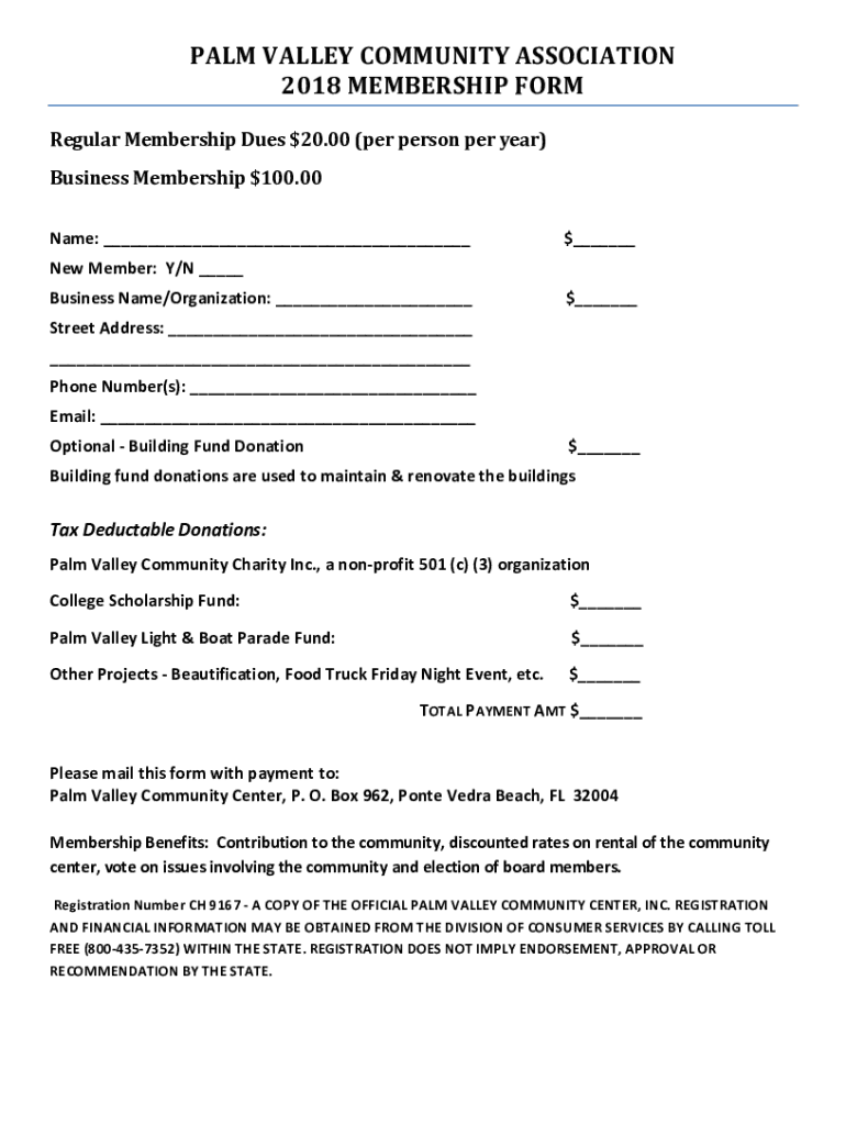 PALMVALLEYCOMMUNITYASSOCIATION 2018MEMBERSHIPFORM RegularMembershipDues$20.00(perpersonperyear) BusinessMembership$100.00 Name: $ Remember:Y/N Businessman/Organization: $ StreetAddress: