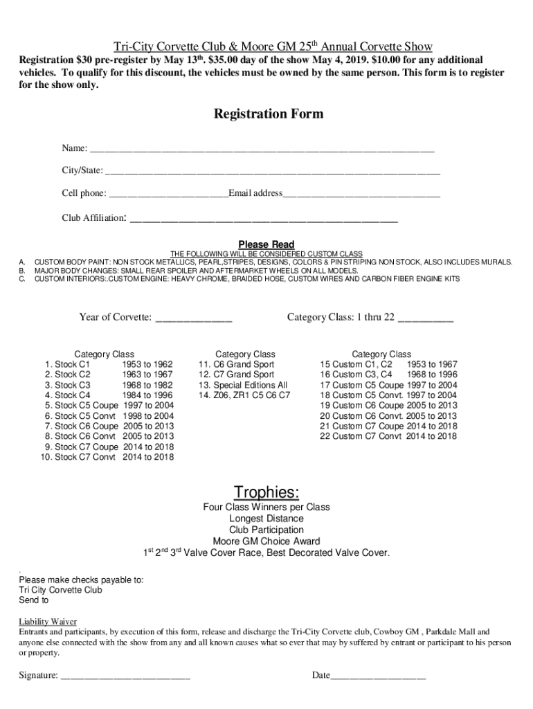 Trinity Corvette Club & Moore GM 25th Annual Corvette Show Registration $30 preregister by May 13th. $35.00 day of the show May 4, 2019. $10.00 for any additional vehicles. To qualify for this discount,
