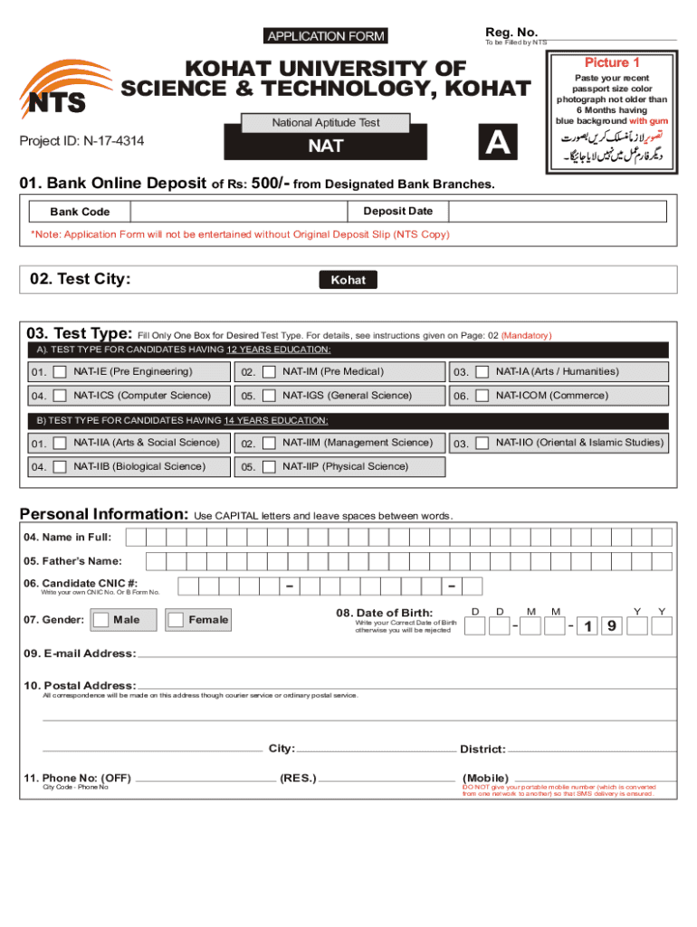 Reg. No.APPLICATION Form be Filled by Picture 1KOHAT UNIVERSITY OF SCIENCE & TECHNOLOGY, KOHATPaste your recent passport size color photograph not older than 6 Months having blue background with subnational