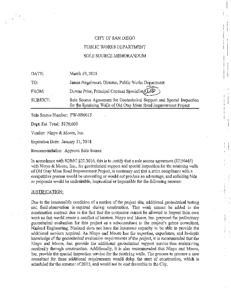 . 'CITY OF SAN DIEGO PUBLIC WORKS DEPARTMENT SOLE SOURCE MEMORANDUMDATE:March 19,2015TO:James Nagelvoort, Director, Public Works DepartmentFROM:Downs Prior, Principal Contract SpecialisSUBJECT:Sole