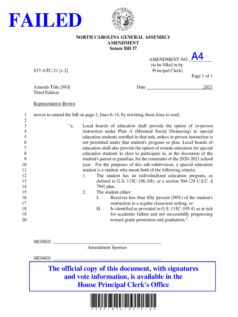 FAILED NORTH CAROLINA GENERAL ASSEMBLY AMENDMENT Senate Bill 37A4 A4AMENDMENT NO. (to be filled in by Principal Clerk) Page 1 of 1S37ATC21 v.2 Amends Title NO Third EditionDate,2021Representative