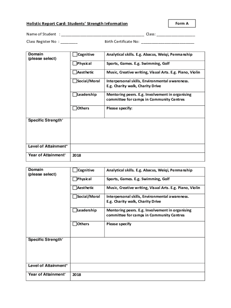 Holistic Report Card: Students Strength InformationForm Name of Student : Class: Class Register No : Domain (please select)Birth Certificate No: CognitiveAnalytical skills. E.g. Abacus, Wadi, PenmanshipPhysicalSports,