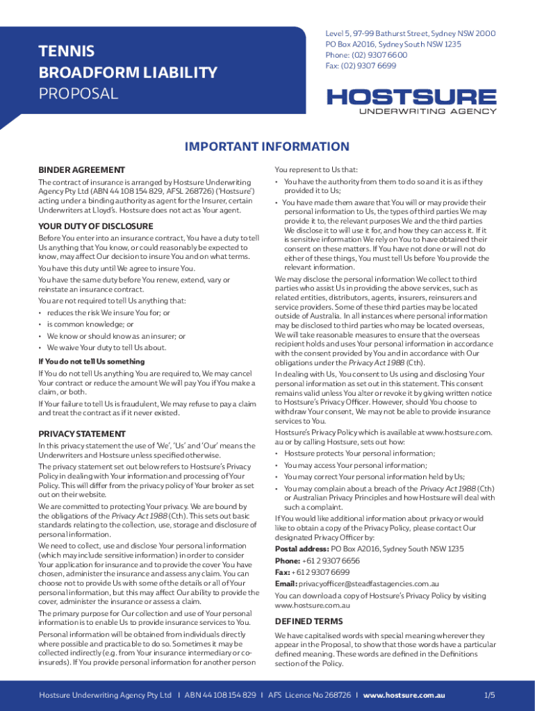 Get the free TENNIS BROADFORM LIABILITY PROPOSAL - Hostsure