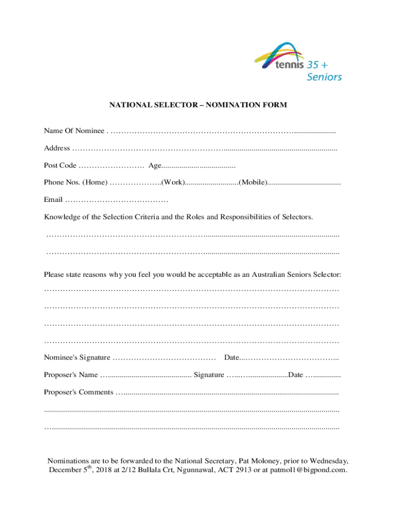 NATIONAL SELECTOR NOMINATION Forename Of Nominee. ..................... Address ......................................................... Post Code. Age..................................... Phone