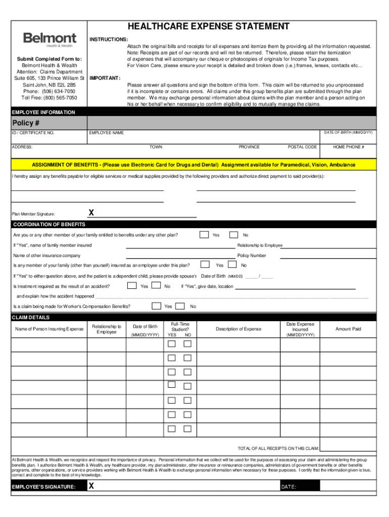 HEALTHCARE EXPENSE STATEMENTSubmit Completed Form to: Belmont Health & Wealth Attention: Claims Department Suite 605, 133 Prince William St Saint John, NB E2L 2B5 Phone: (506) 6347050 Toll Free: (800)