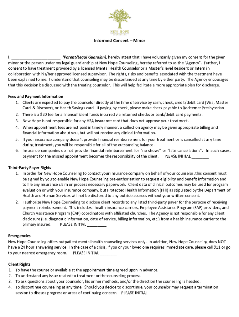 Informed Consent Minor I, (Parent/Legal Guardian), hereby attest that I have voluntarily given my consent for the given minor or the person under my legal guardianship at New Hope Counseling, hereby