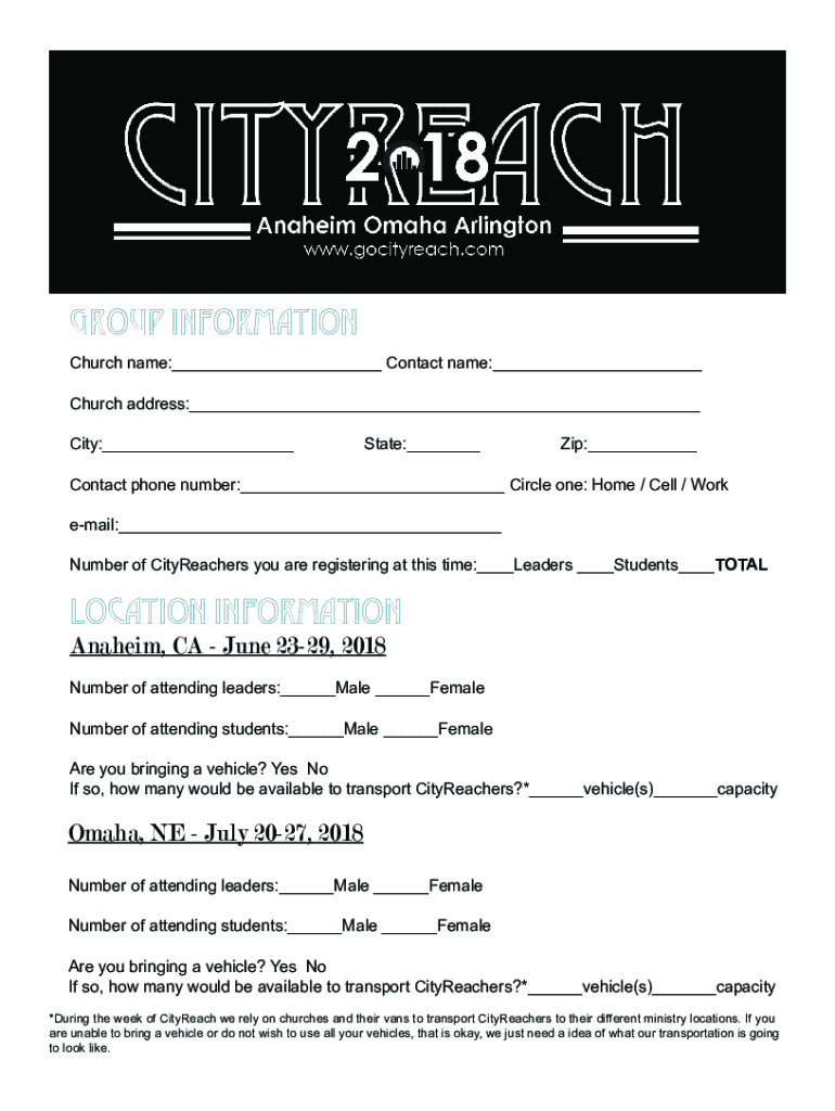 Group Information Church name: Contact name: Church address: City: State: Zip: Contact phone number: Circle one: Home / Cell / Work email: Number of CityReachers you are registering at this time: