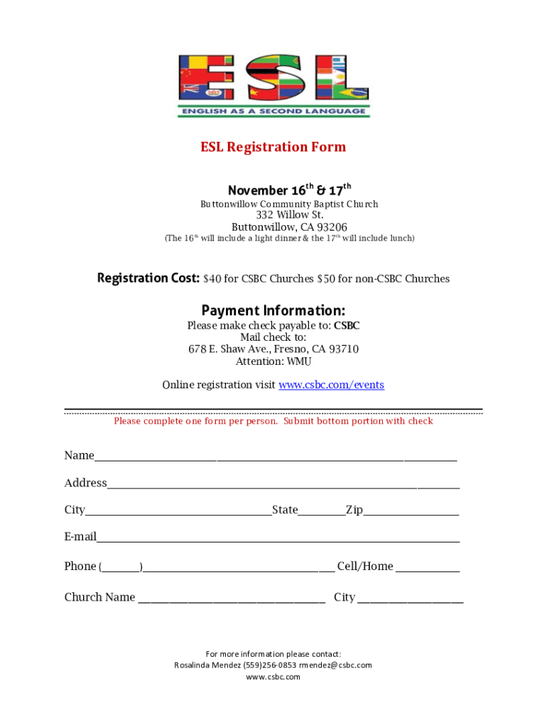 ESL Registration Form November 16th & 17th Button willow Community Baptist Church332 Willow St. Button willow, CA 93206(The 16th will include a light dinner & the 17th will include lunch)Registration