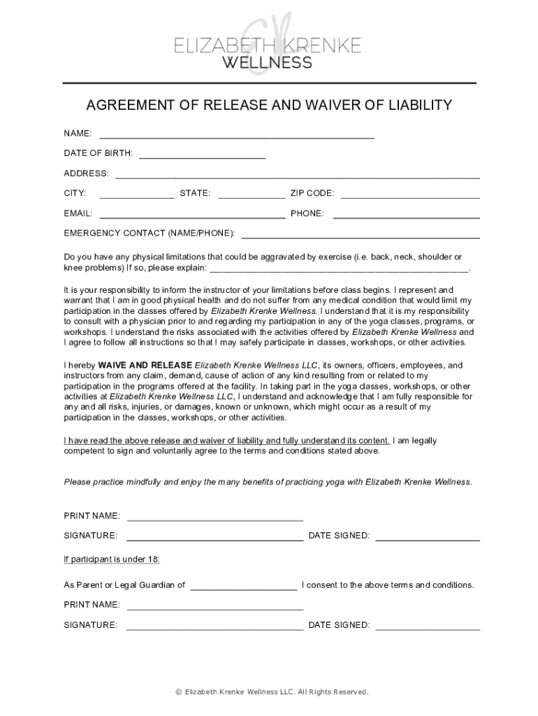 Therefore, anyone who wants to engage in yoga classes, workshops, or other wellness activities at ek wellnessyoga must complete and sign this release form.