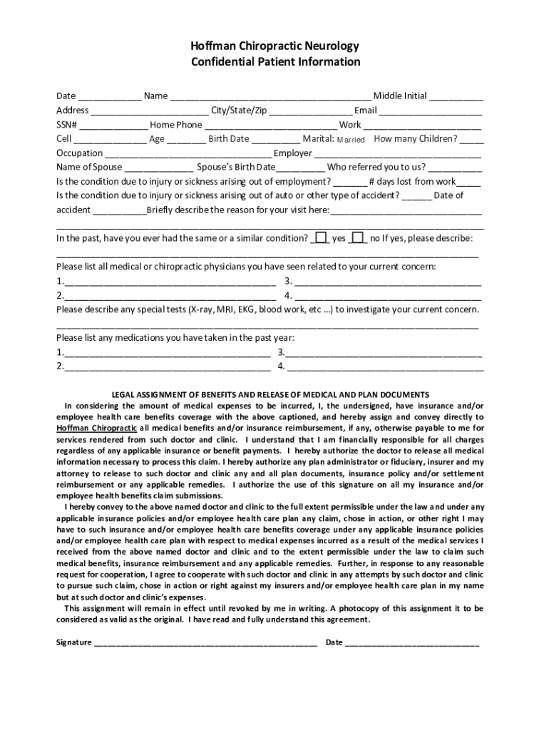 Hoffman Chiropractic Neurology Confidential Patient Information Date Name Middle Initial Address City/State/Zip Email SSN# Home Phone Work Cell Age Birth Date Marital: Married How many Children? Occupation