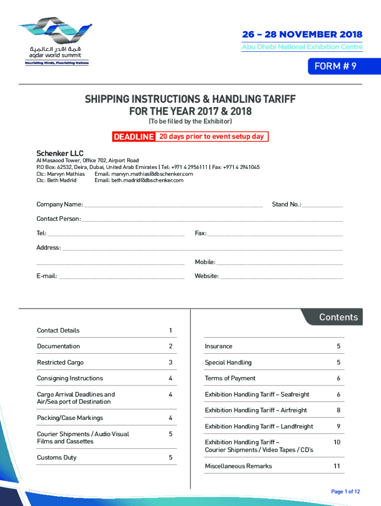FORM # 9SHIPPING INSTRUCTIONS & HANDLING TARIFF FOR THE YEAR 2017 & 2018 (To be filled by the Exhibitor)DEADLINE 20 days prior to event setup day Checker Local Manhood Tower, Office 702, Airport Road