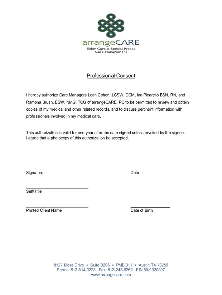 Professional Consent hereby authorize Care Managers Leah Cohen, LCSW, CCM, Ina Pocatello BSN, RN, and Ramona Brush, BSW, BMG, TCG of arrange CARE PC to be permitted to review and obtain copies of