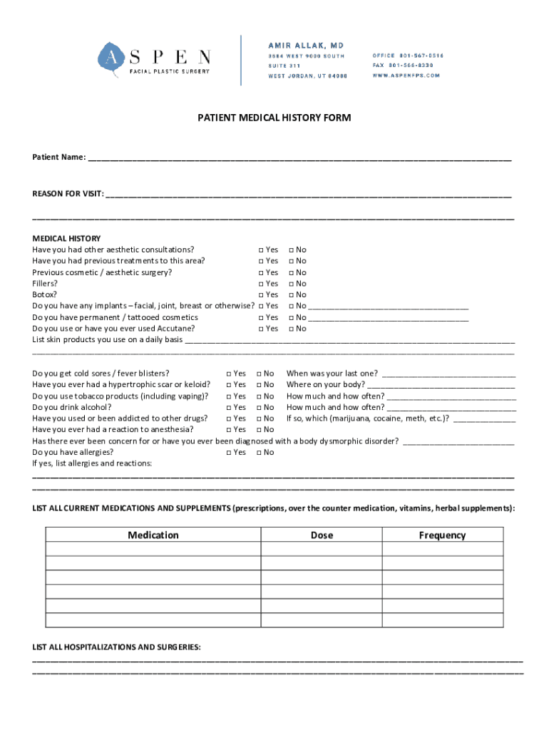 PATIENT MEDICAL HISTORY Formation Name: REASON FOR VISIT: MEDICAL HISTORY Have you had other aesthetic consultations? Yes No Have you had previous treatments to this area? Yes No Previous cosmetic