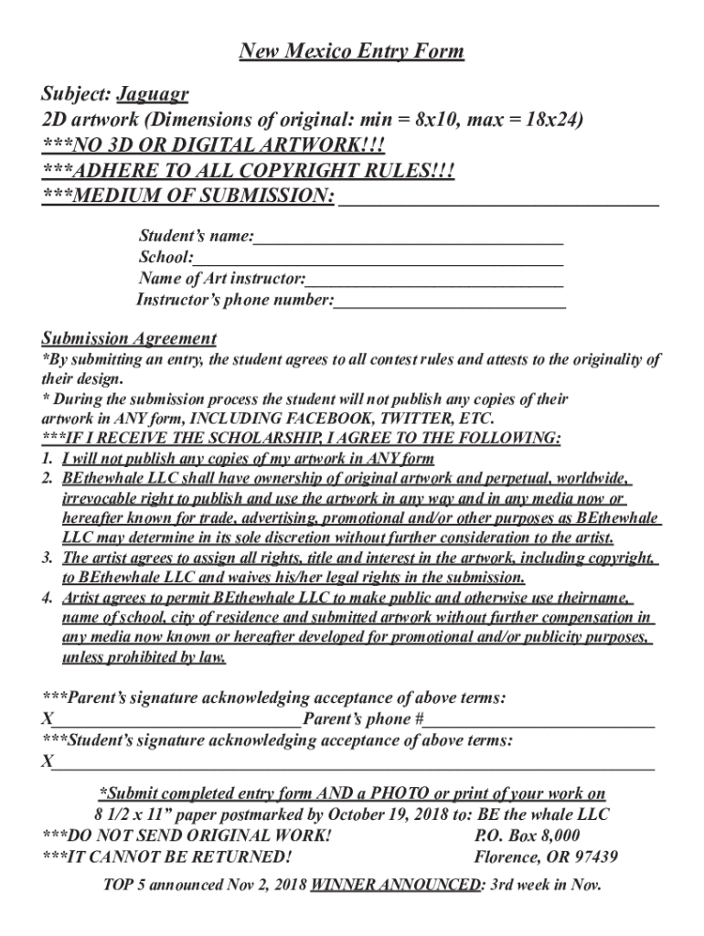 New Mexico Entry Form Subject: Jaguar 2D artwork (Dimensions of original: min 8×10, max 18×24) ***NO 3D OR DIGITAL ARTWORK!!! ***ADHERE TO ALL COPYRIGHT RULES!!! ***MEDIUM OF SUBMISSION: Students