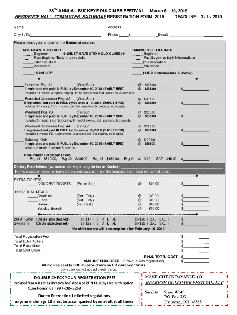 28 TH ANNUAL BUCKEYE DULCIMER FESTIVAL March 6 10, 2019 RESIDENCE HALL, COMMUTER, SATURDAY RESIST RATION FORM 2019 DEADLINE: 3 / 1 / 2019 Name Address City/St/iPhone () Email: Please check y our choice