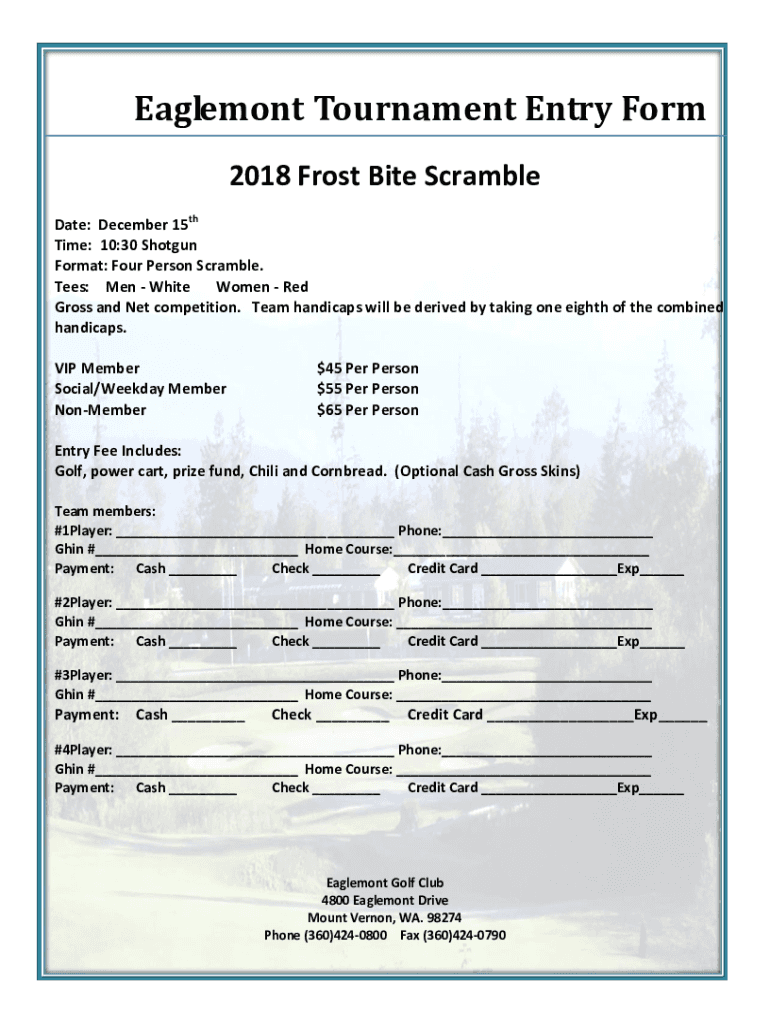 Element Tournament Entry Form 2018 Frost Bite Scramble Date: December 15th Time: 10:30 Shotgun Format: Four Person Scramble. Tees: Men White Women Red Gross and Net competition. Team handicaps will
