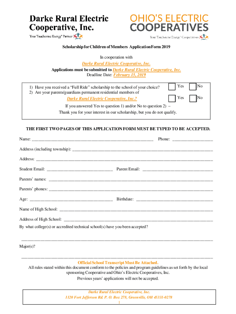 Scholarship for Children of Members Application Form 2019 In cooperation with Dark Rural Electric Cooperative, Inc. Applications must be submitted to Dark Rural Electric Cooperative, Inc. Deadline