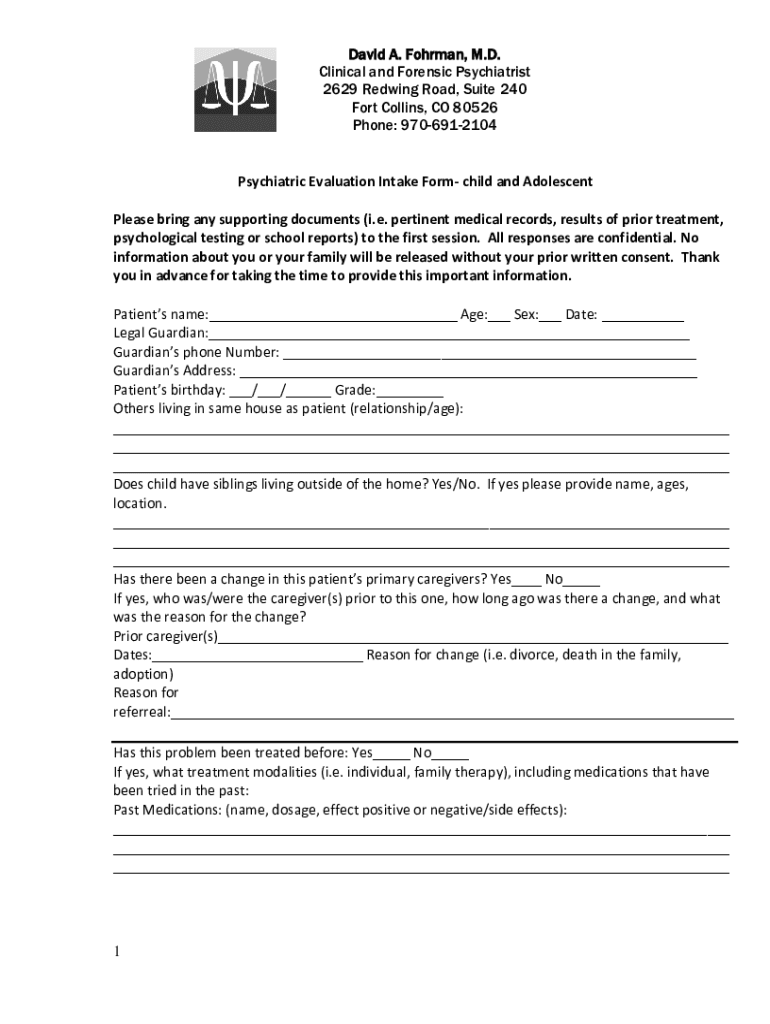 Get the free Psychiatric Evaluation Intake Form - Child and Adolescent