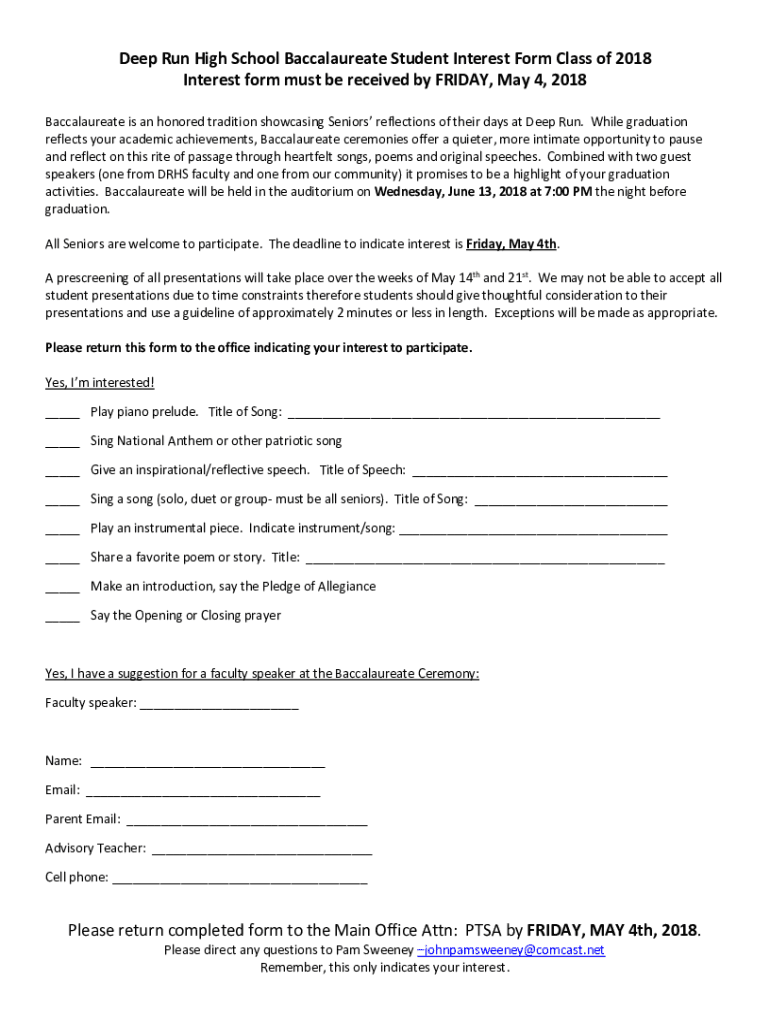 Deep Run High School Baccalaureate Student Interest Form Class of 2018