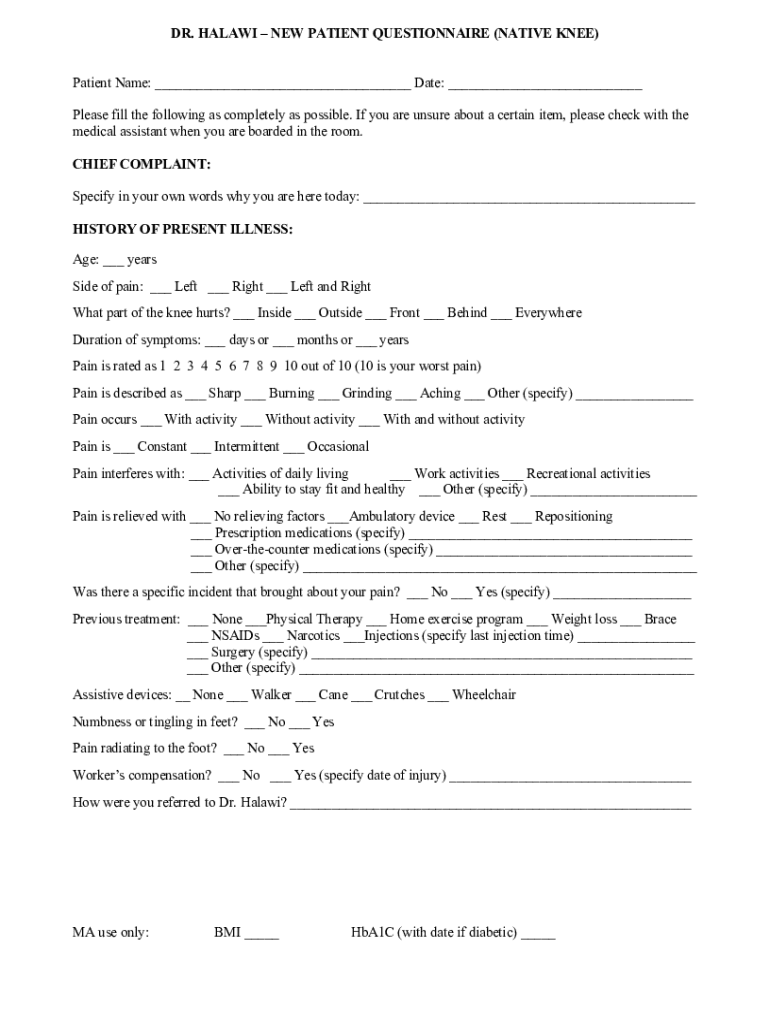 DR. MALAWI NEW PATIENT QUESTIONNAIRE (NATIVE KNEE)Patient Name: Date: Please fill the following as completely as possible. If you are unsure about a certain item, please check with the medical assistant