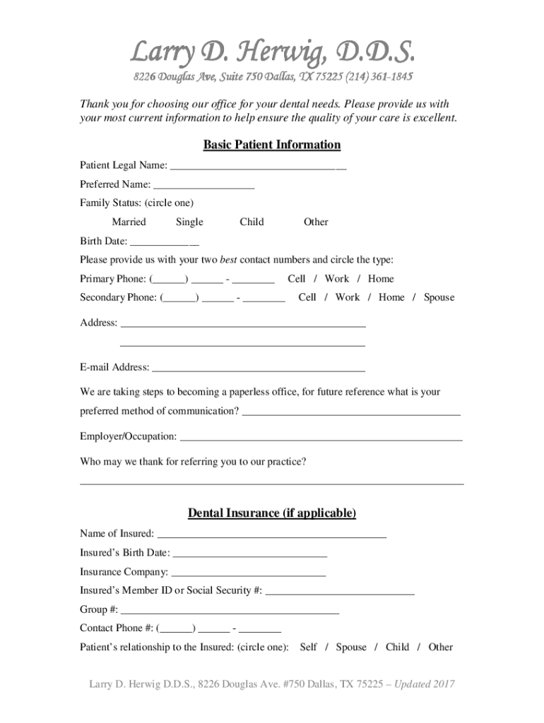 Larry D. Her wig, D.D.S. 8226 Douglas Ave, Suite 750 Dallas, TX 75225 (214) 3613611845 Thank you for choosing our office for your dental needs. Please provide us with your most current information